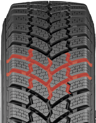 Особая архитектура протектора, включающая в себя обилие волнообразных ламелей, усиливает взаимодействие с поверхностью дороги. Такая структура буквально «вгрызается» в лёд, обеспечивая полный контроль над авто. Разнонаправленные блоки и узоры обеспечивают надёжное торможение, а также сокращают тормозной путь даже при резком замедлении на обледеневшей трассе.